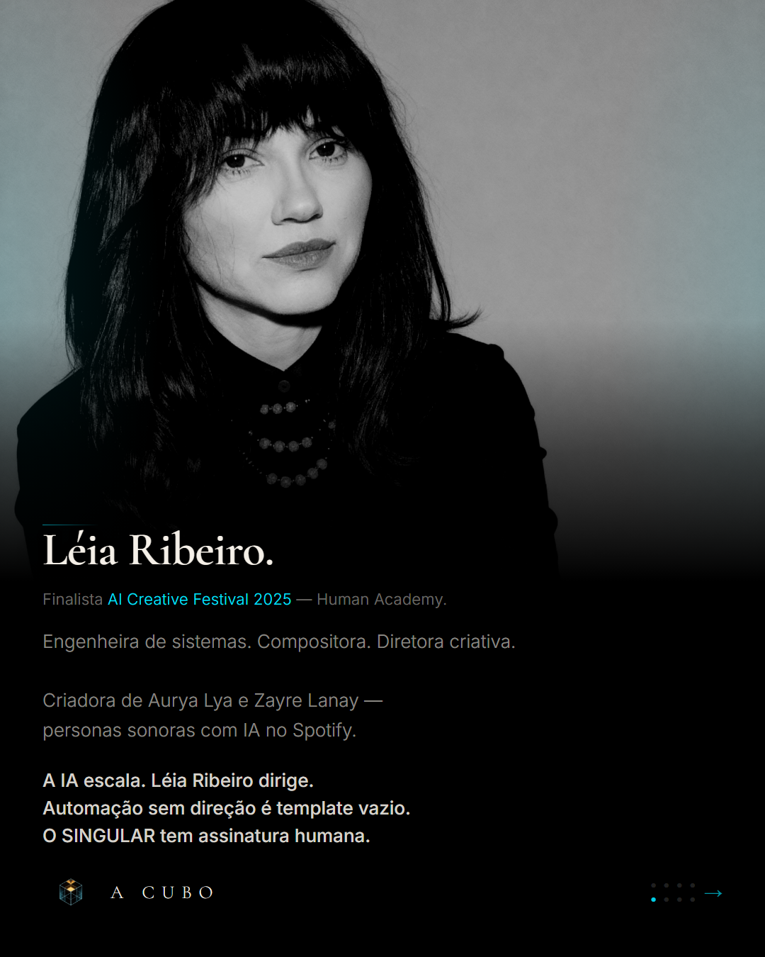 Engenheira de sistemas algorítmicos e compositora, Léia dirige a A Cubo com a mesma precisão com que escreve código e compõe música.